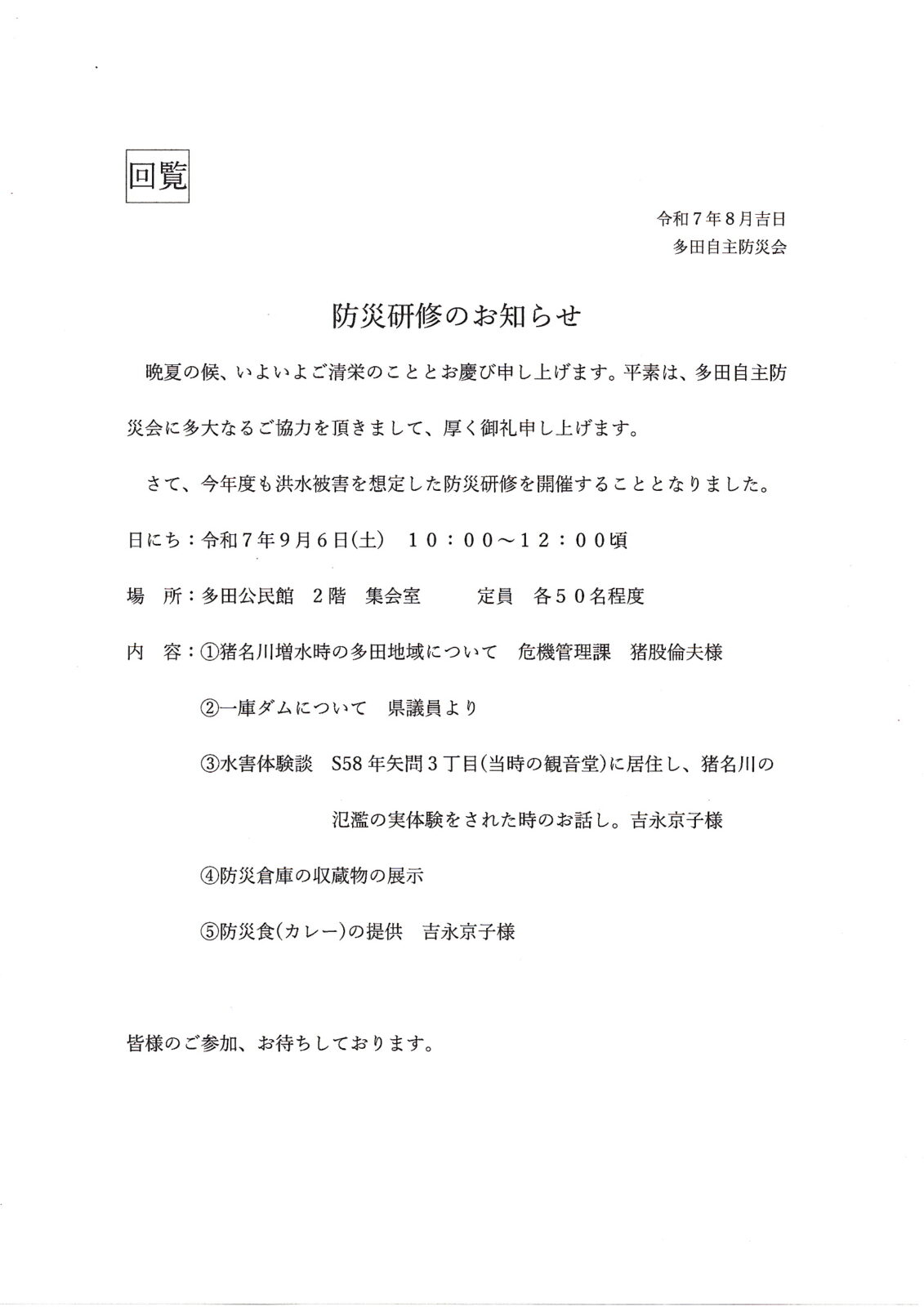 HOME > Warning: Undefined array key 0 in /home/tadacomy/tadacomy.jp/public_html/wp-content/themes/stingerplus2/single.php on line 31 Warning: Attempt to read property "cat_ID" on null in /home/tadacomy/tadacomy.jp/public_html/wp-content/themes/stingerplus2/single.php on line 31 防災研修(2025) 投稿日:2025年8月8日 イベント詳細 日付: 2025年9月6日 10:00 – 12:00 カテゴリ: ⑤自治会, 多田コミュニティ, 多田公民館, 多田自主防災会 多田自主防災会より、防災研修のお知らせが届きました! ご家族、ご近所の皆さま、お誘い合わせのうえ、ぜひご参加ください! Post Views: 130 -