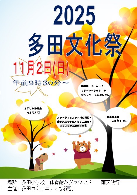 HOME > TDSサポーターズ > TDSサポーターズ ⑤自治会 イベント 多田コミ(ブログ) 多田子ども教室 多田幼稚園 秋は、🍁多田文化祭(2025)です🍂 投稿日:2025年10月4日 秋🍂らしくなってきましたね😊【多田文化祭】の季節です❗️ステージフェスティバルや、模擬店🍴、作品展🖼️やフリーマーケットなどなど、お楽しみがいっぱいです✨ご近所さん、お友達と一緒にぜひ遊びに来てください❗️🙋♀️ Post Views: 33 -TDSサポーターズ, ⑤自治会, イベント, 多田コミ(ブログ), 多田子ども教室, 多田幼稚園