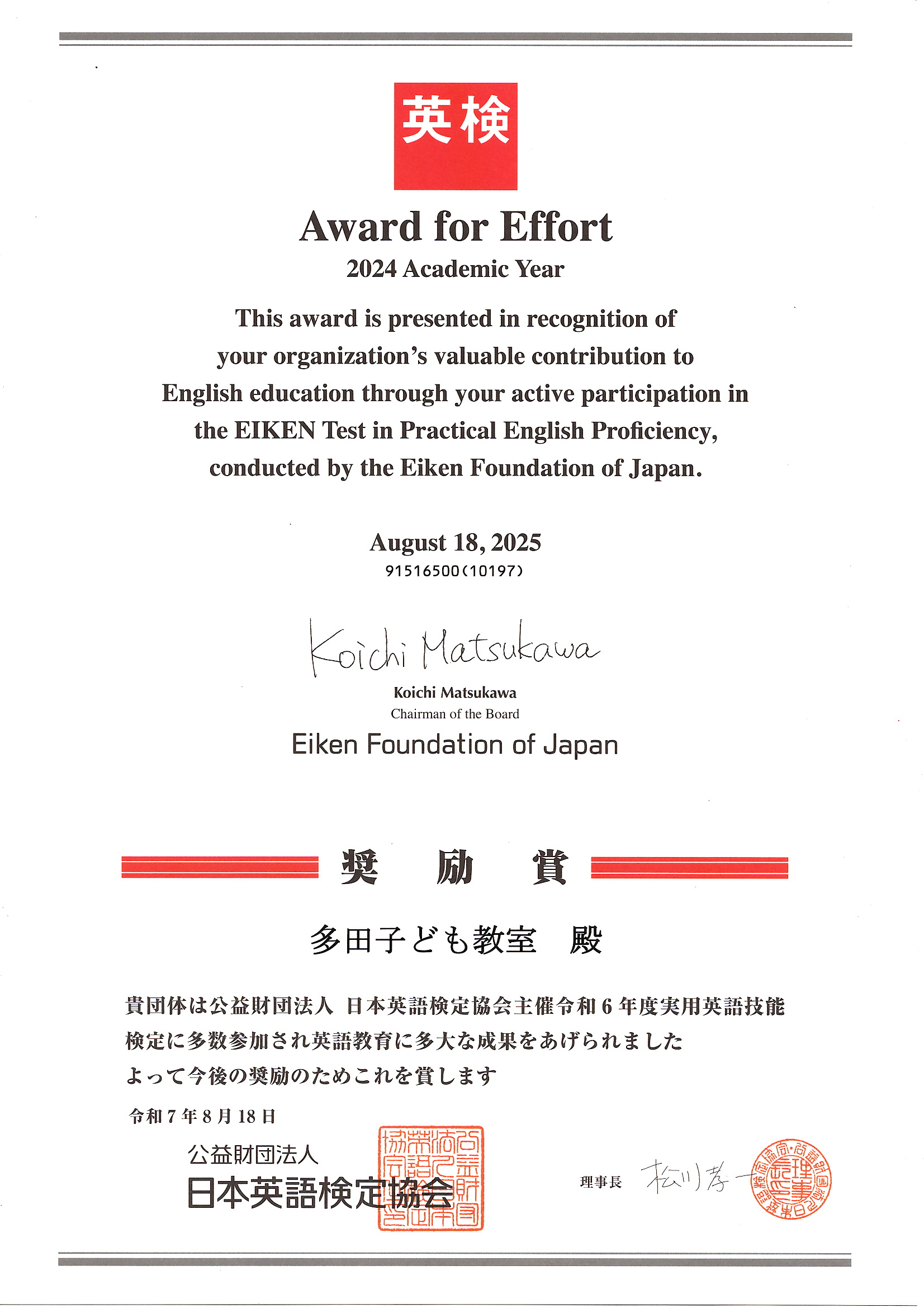 多田子ども教室が、日本英語検定協会より【奨励賞】を受賞されました❗️
